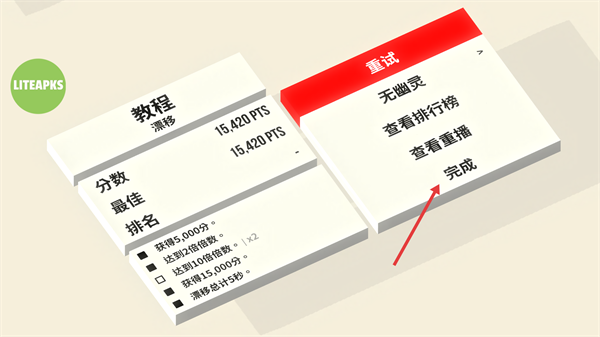 4、關(guān)卡結(jié)束后查看分?jǐn)?shù)與完成目標(biāo),點(diǎn)擊【完成】結(jié)算。