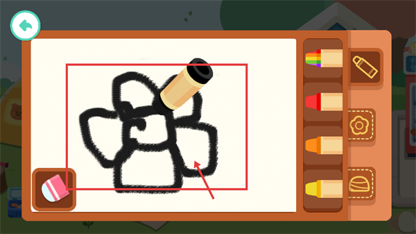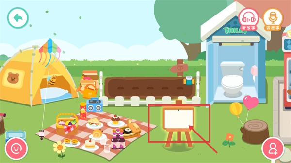 1、看到公園野餐場景,點擊紅色框選的【畫板】區(qū)域,進入繪畫互動環(huán)節(jié),開啟本次創(chuàng)意繪畫的游玩步驟。